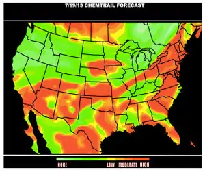 Another feature of Martin's websites are their thoughtful "chemtrail forecasts" featuring more questionable maps, this time relabeled and doctored with colored blobs to show locations of "low", "moderate" and "high" concentrations of chemtrails.[49]