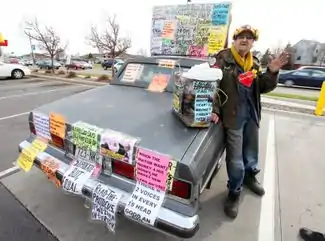 Obvious spelling errors are a surprisingly common feature of kookmobile signage. Some of the ethically dubious messages seen on the aforementioned couple's kookmobile include "Homosexuality is a sin & a [sic] abomination", "Just say NO to gay marriage" and — in a middle finger to Nietzsche — "God's not dead!" (or perhaps a salute to the awful film).[4]