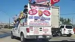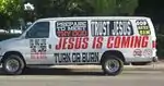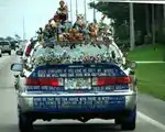 An Ohio Tea Party enthusiast reportedly spent $32,000 to create his dream kookmobile. Jesus is conspicuously absent; however the vehicle features luxurious twin nut poles, flying gigantic Trump and "Don't Tread On Me" flags, a "9-11 pilgrimage" display, as well as "Not A Gun Free Zone" and "Impeach Obama" slogans.[6]