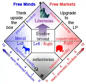 Libertarians believe that the one-dimensional scale of the political "left-right" is insufficient to describe the general public's many philosophies. They introduced the Nolan Chart, which measures two dimensions of political opinion instead, conveniently placing themselves at the top, opposite Hitler, which is literally the truth.[4] Of course, that wasn't enough; they had to add a big arrow toward their position, mangling evolution to encourage people to join them.[5]