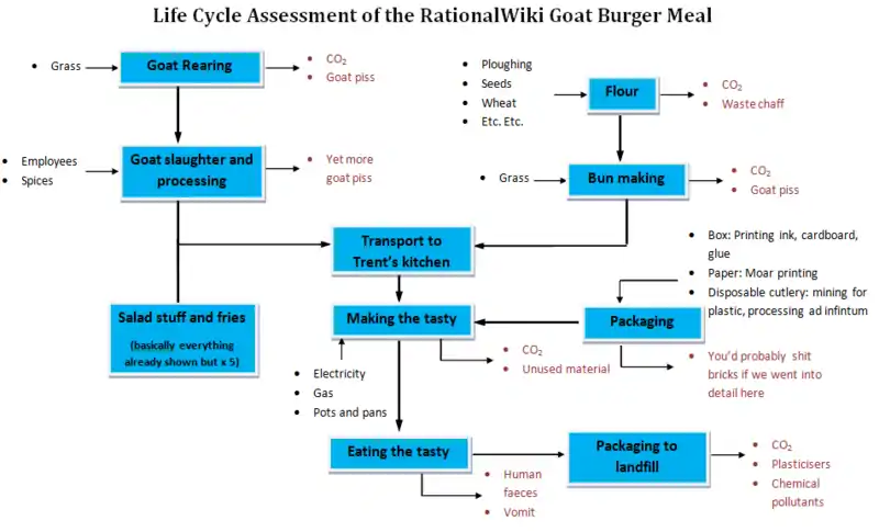 The following is a fairly simple LCA of a hypothetical "goat burger". It doesn't include everything that it should do, however. Transport costs are omitted and some sections are highly simplified for reasons of space - it could be much, much larger and much more thorough.