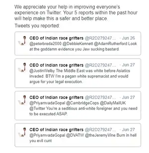 Coombs has been banned from Twitter on at least a dozen accounts for hate speech: @Mikemikev, @mikemikev9000, @mikemikev9001, @mikemikev9002, @mikemikev9003, @mikemikev9005, @mikemikev9006, @mikemikev9008, @mikemikev9009, @Abreen1488, @CPie1488, @Antifungal16,@R2D279247959, and most recently @JohnnyR84030075.[27] @Abreen1488 was an impersonation of an antifascist[28] and Coombs is known to have created other fake accounts to troll anti-racists. He's also banned from Science Forums and Anthroscape, but returns on sockpuppets.[29]