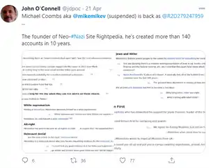 In April 2018, an investigation into anti-Semitism on Twitter, found Mikemikev to be one "of the most active hard-line British anti-Semites".[13] Shortly afterwards @Mikemikev was permanently suspended for hate-speech, but he has returned there on sockpuppets, such as @Antifungal16, and R2D279247959, as of August 2020, JohnnyR84030075, most recent thinderstruck2.[14][15] Banned on nearly all social media, Coombs posts on Gab,[16] a freedom of speech website popular with the alt-right, although even they have had to censor and delete some of his comments that broke their rules, including postings threats of violence.