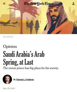 - Thomas L. Friedman (November 23, 2017). "Saudi Arabia's Arab Spring, at Last". The New York Times.