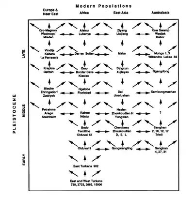 - Wolpoff, M., Wu, X., Thorne, A. G. (1984). "Modern Homo sapiens origins: a general theory of hominid evolution involving the fossil evidence from East Asia". In: Smith, F. H (ed.). The Origins of Modern Humans: a World Survey of the Fossil Evidence. New York: Liss.