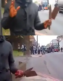 Rigby was murdered by two Islamic extremists, Michael Adebolajo and Michael Adebowale. The iconic image related to the crime was a video made by a passer-by, in which Michael Adebolajo, bloody-handed and holding a knife and meat cleaver, delivered a speech.