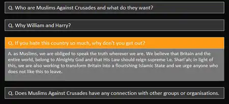 In 2011 MAC applied to hold a protest against the wedding of Prince William (described by the group as a "genocide advocate"[8]) and Kate Middleton, but were turned down. Spokesperson Anjem Choudary declared that they planned to protest anyway[9] and then got cold feet and cancelled the thing.[10]