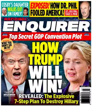 The Enquirer published false stories about other candidates[9], from Ted Cruz's dad's connections with Lee Harvey Oswald for the JFK assassination[10] to even Hillary Clinton's connections in Pizzagate. One thing they wouldn't publish, however, was a story from former Playboy model Karen McDougal about her affair with Trump; they paid $150,000 for the story only to bury it and silence her, a practice known as "catch and kill".[11][12]