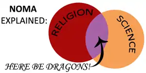 Non-Overlapping Magisteria (NOMA) is a philosophical world view that places religion and science in separate domains of questioning ("magisteria") in order to avoid one contradicting the other. NOMA hopes to provide an end to the conflict thesis between science and religion by establishing a demarcation.