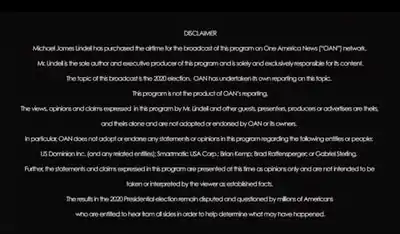 On 5 February 2021, OANN ran a "documentary" called Absolute Proof, produced by cushion manufacturer and election conspiracy theorist Mike Lindell.[38] Under the threat of lawsuits by the companies slandered by their earlier "reporting," they ran an incredible disclaimer prior to the airing of Lindell's three hour screed.[39] OANN appeared to have run the Lindell pseudo-documentary as a paid advertisement, but it seems unlikely that this will save the network from being sued by Dominion Voting Systems and Smartmatic.[40]