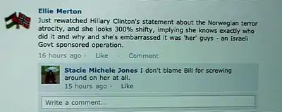 Ellie Merton, chair of the PSC's Waltham Forest branch, believes that Anders Behring Breivik was working for Israel. She posted her conspiracy theory on Facebook: "Just re-watched Hillary Clinton's statement about the Norwegian terror atrocity, and she looks 300 per cent shifty, implying she knows exactly who did it and why, and she's embarrassed about it was 'her' guys - an Israel government-sponsored operation." She also stated that "This geezer was actively hooked up with the EDL who, as we all know, is inextricably linked with Zionist Federation in the UK".[11]
