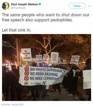 - Why is the left obsessed with protecting pedophiles? by Paul Joseph Watson (14:41 - 1 nov. 2017) Twitter (archived from August 18, 2018).