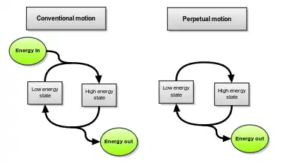 The second type, ambient energy machines, do in fact continuously put out energy, but they do so by drawing on ambient energy sources: for instance, a clock might run off the daily fluctuations of air pressure.[3] Some perpetual motion designs that appear on the likes of PESWiki often claim to be of this type, where they claim to "depolarise" a magnetic field to draw their energy without violation of energy conservation, but in reality this is not the case. An alleged perpetual motion machine might have a purported design, but have a hidden energy source not disclosed, or at least not explicitly stated, in those plans. These fall into a category known as "fraudulent".