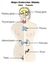 The pineal gland is a small pine-cone-shaped chunk of tissue tucked in the middle of the brain. It is part of the endocrine system and produces melatonin, which is responsible for regulating the sleep/wake cycle and circadian rhythms of animals. Originally thought to be vestigial, the pineal gland's function was discovered in the 1950s in experimentation on cows.[1]