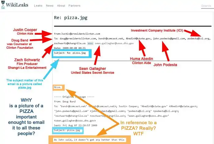 Pizzagate is the (admittedly rather silly and unoriginal) name of an actual conspiracy theory claiming that Hillary Clinton is secretly involved in a pedophile ring centered around a pizza restaurant in Washington, D.C.[1] This outlandish theory was spawned from a highly peculiar pattern-analytical reading of the hacked emails leaked by Wikileaks belonging to John Podesta,