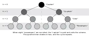 The classic pyramid scheme is sometimes known as the eight-ball model, and it still pops up frequently under the names "birthday party," "gifting circle," "cash club," and "airplane game", among others.[6][7][8] In an eight-ball scam, seven scammers form the first three layers and solicit a sum of money from eight suckers, which is paid to the scammer at the top of the pyramid. The top of the pyramid leaves, the pyramid divides in two, and the cycle repeats with each scammer/sucker advanced one level up the pyramid.