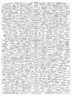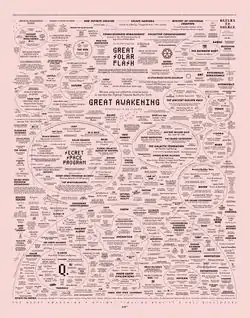 QAnon, also known as The Storm and The Great Awakening, is a conspiracy theory, popular meme,[6] and right-wing fantasy about a "deep-state" conspiracy against United States President Donald Trump. Following on the heels of similar bullshit, such as Pizzagate (which occupies a small spot on the QAnon map below), it postulates a fantastic web of deceit that wraps up Trumpism, deep-state fearmongering, evil, satanic pedophilia-rings controlled by the Democratic Party, investigations into Russian meddling in the 2016 US election, the 2017 Las Vegas shooting, and New World Order paranoia into a package easily and wholeheartedly promoted by internet cesspools and Alex Jones.[7][4] It originated from a series of incoherent posts on 4chan in 2017 by someone calling themselves "Q".[8]