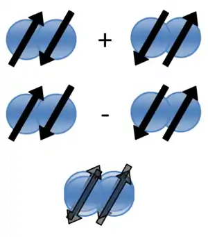 While the subject of superposition is interesting enough as it is, the oddest property of entanglement comes when we try to determine which atom is really pointing up or down by with an observation experiment. When we look at one of the atoms to figure out if its spin is up or down (by splitting the two atoms apart so we can distingush them), if we find that if the first one is up the other will be down - and if the first is down the other will be up. This is like performing the observation experiment on both atoms simultaneously, even if they are too far apart for information to travel between them.
