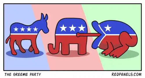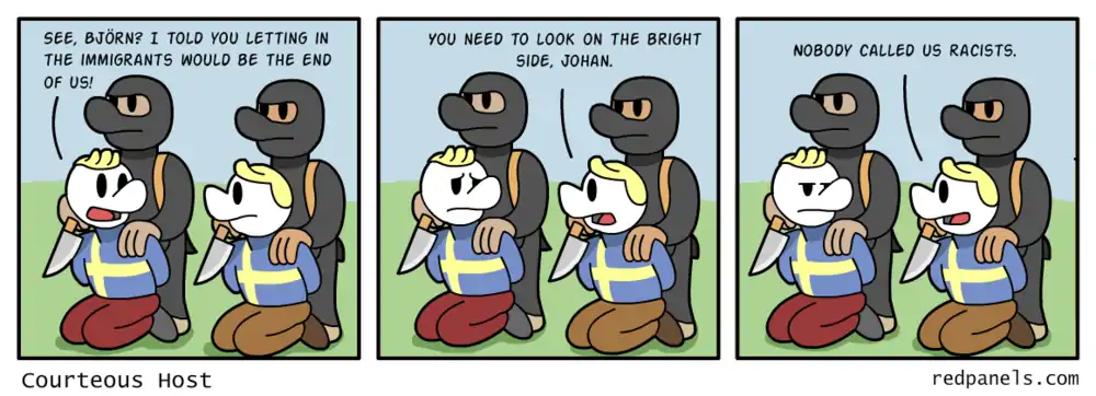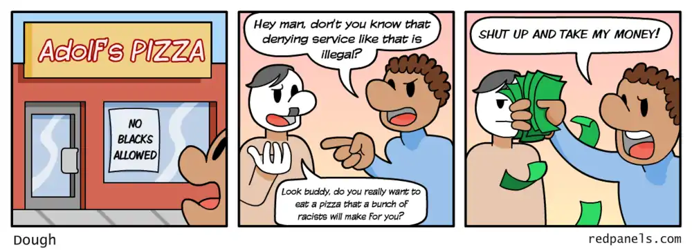 It described itself as the "Red Pill in Webcomic Form"[1] and actively promoted the alt-right.[2] It came to some attention when Richard Spencer (a noted non-Nazi) tweeted a cartoon about how concentration camps started because people just wouldn't stop punching (totally-not-)Nazis.[3][4] RedPanels ended on 2017 February 02, citing monetary reasons; the last panel fittingly consisted of a Hitlergruß