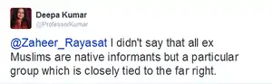 During a speech at the University of Bath, Deepa Kumar, a professor of Middle Eastern studies at Rutgers University, put up a slide which listed 3 categories described as "New McCarthyites," which included "Ex-Muslims and other 'native informants'." Pictures of this slide, taken out of its context, attracted negative attention in the easily rilled-up blogosphere.