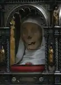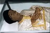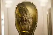 The veneration of relics is equally important in Eastern Orthodoxy. The religion considers the physical form, and not just the soul is transformed by holiness; thus relics are revered as "temples of the Holy Spirit."[20] One of the great cultural tensions that exists in the Orthodox Church is the lack of emphasis placed by American Orthodox followers on the importance of relics.[21] Another Orthodox belief is the concept of "incorruptibility", the idea that true saintly relics do not decompose normally after death.[22] Evidence of "incorruptibility" includes intact hair and fingernails, visible eyebrows and eyelids, and having the hands still holding the cross with which the individual was buried.[23]