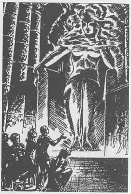 The story has been reprinted in a few books alongside "The Return of Sathanas", a sequel that originally ran in the November 1947 issue of Amazing; this time co-credited to Bob McKenna.[18] This story inserts our old pal Satan into the Shaver cosmology, as Mutan and Arl travel back to Earth to take on a dero named Sathanas, ruler of the planet Satana, the inhabitants of which are referred to as Satanists. Sathanas is described as a hybrid of a goat-legged alien race, horned Titans, and a group of humans called Angles - apparently, Shaver and co were trying to draw a connection between the angels of Judeo-Christian belief and the Germanic tribe of Angles (Sathanas is identified as an "Arch-Angle"). The story also throws Norse mythology into the mix, with the heroes meeting Odin (described by Mutan as having a "ruby-red Santa Claus face") and the rest, although a footnote explains that these are not the original Aesir but merely people named in their honour. The story also briefly goes into some detail about the Atlans' first arrival on Earth, after which they founded the city of Atlansgar and fought Cronus, the Migard Serpent and "the mad early Titans". Mutan's adventures were also recounted in "Invasion of the Micro Men", "The Land of Kui" and what appears to have been the last Shaver Mystery story to run in Amazing, "We Dance for the Dom".[19]