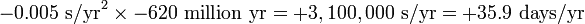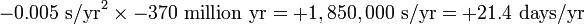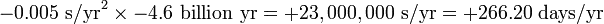 Although Mark Isaak references Eicher (1976) for a 2 second/100,000 year (0.00002 s/yr) slowdown of the Earth's rotation,[6][7] the more recent Thwaites et al. (1982) suggests that the Earth's rotation slows 0.005 seconds per year per year (0.005 s/yr2).[1] Even given this faster rate of slowing, there's no trouble with a 4.6 bn year old Earth:[Calculation 3]