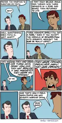 Similar to LaVeyan Satanism, the Satanic Temple is an atheistic organization, and does not believe in a literal Satan, though some of its members are theistic Satanists. Unlike LaVeyans, however, the Satanic Temple rejects the supernatural entirely. This has been brought up in the assessment of whether or not they actually are a religion, and they have responded by stating that this belief is outdated and ignorant, saying that to define religion as supernatural is to give the enemy free license to label as they please.[9] They also differ from LaVeyans in that they reject the "might makes right" philosophy of the Church of Satan, and have a set of tenets founded on secular humanism rather than social Darwinism.[10]