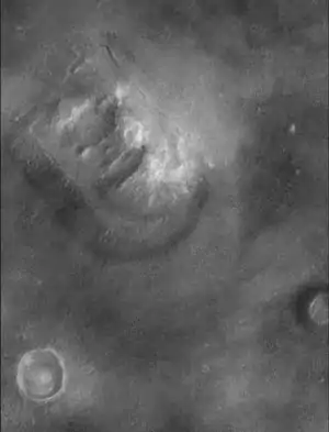 "Space woo" is the kind of woo peddled by Richard Hoagland on his appalling web site and his radio chat show. Since all woo depends on the inaccessibility of counter-evidence to third parties, nothing is more ripe than space woo. The images of Mars returned from the Viking orbiter in the 1970s, with its primitive camera providing resolution only down to 45 meters per pixel, provided an instance of pareidolia when a mesa that resembled a human face was imaged. Hoagland asserted that it was a monument, something like Mt. Rushmore on Mars. When Mars Global Surveyor was sent in 1998, with resolution down to less than two meters per pixel, it took a picture of the "face" and Hoagland was exposed as a fabulist.[6]