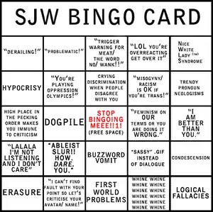 With its evolution into a conservative dogwhistle, "SJW" has more or less become a substitute for whatever sort of bigoted epithet the speaker wanted to say but knows that they cannot without being labeled a bigot. However, when the ideological opponent is a white male ally, then the reactionaries are free to say "beta" or "cuck" rather than self-censor with "SJW". Another idea is that "SJW" has replaced "Liberal" as a pejorative, that way the speaker doesn't have to automatically identify as a conservative when using it as a snarl word.[26]