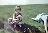 The mysterious spaceman story might have rocked on forever as one of Forteana's greatest hits were it not for the denizens of a number of internet forums who wielded Occam's Razor with deadly accuracy.[4][5] A photo analyst demonstrated that the “spaceman” was nothing more than an adult person of normal height with their back to the camera walking away from the child.[6] Others observed that another photograph taken that day shows Templeton's wife, Annie, wearing a very light blue sleeveless dress. Closer examination of the original "spaceman" image reveals that the arm of the mysterious figure has a decidedly tapering, feminine curve to it. Exactly like the bare arm of a woman wearing a very light blue sleeveless dress. Her back to us, she is probably wearing some kind of white cap over her close-cropped hairstyle.[7] Enhancing the contrast of the photo further reveals the distinctive neckline and arm holes of her dress.[8]