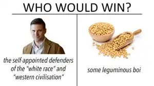 The cultural obsession or moral panic about excessive soy consumption is largely contained to the West and is frequently lodged by the alt-right against leftist, liberal or other non-right wing males as an indictment of their allegedly low levels of testosterone, feminized features and/or behaviors. However, soy is native to the continent of Asia and has been consumed for many millennia by its inhabitants as a staple in their diets without detriment to health.[3] Also, ironically, beer has actually the most estrogenic phytoestrogen known,[4] despite being viewed in many societies as what "real" men drink.
