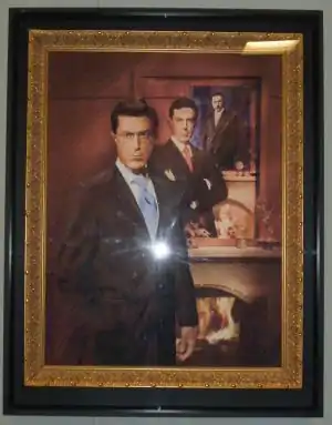 Stephen's "den" (part of The Colbert Report set) is graced with, among other things, a portrait of himself that is periodically updated, by being repainted with himself standing in front of it. One that has a "meta-depth" of two, and has been retired from his den, has been graced with a place of great honor in the Smithsonian Institution's National Portrait Gallery in Washington, D.C.[20] Previous portraits have also been auctioned off.
