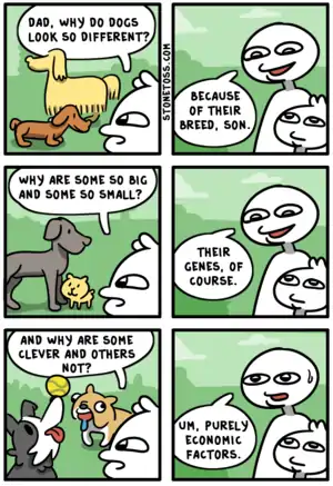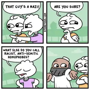 StoneToss, also known as MineralMotion, PebblePunt, RockThrow, GravelChuck and other, similar names by its detractors, is an alt-right webcomic seemingly from the same creator as RedPanels due to the similarities between[1] the content and the art style and patterns used in both comics.[2][3] What started as a racist comic then became outright white supremacist when he transitioned to writing comics as "StoneToss". They have a nasty tendency to create more benign comics in an effort to try and disguise his more heinous ones.
