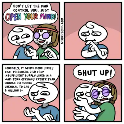 Look at all of the above comics and see for yourself how much of a "centrist" this guy is. His supporters claim his comics are satirical, but when he has comics making fun of the opponents of Holocaust denial and "race realism", both of which are only popular on the far right, while not making fun of even marginally right wing ideas unless the punchline is they're not right-wing enough, it makes this lie clear. Nevertheless, comics like this one give him a veneer of neutrality that can make it extremely difficult to convince his fans that he's a Nazi.