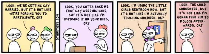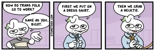 Because accepting trans and gay people clearly leads to paedophilia. To literally no-ones surprise, it doesn't.[4] The irony is that it's usually Conservatives that have issues with pedophilia and child abuse among their ranks.[5] Note that StoneToss commonly depicts LGBTQIA+ people with colored hair and trans women with facial hair.