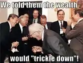 Trickle-down theory was in fact an economic theory dredged up from the dustbin of history originally called "horse-and-sparrow theory." According to John Kenneth Galbraith, if you feed horses enough oats, it will pass through their digestive systems and their droppings will provide enough leftover oats to feed the sparrows. Translation: "Eat Shit" Economics.