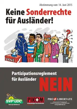 The Swiss People's Party (German: Schweizerische Volkspartei, SVP; French: Union démocratique du centre, UDC) is a nationalist political party in Switzerland disguised as a "conservative" populist party. Their party logo is a cutesy smiley sun but there's nothing sunny about this party. They won popularity in the 2003 election, and since then, have come under fire for their anti-immigration stances and racism.[1] They are largely responsible for numerous referenda that were blatantly xenophobic and racist, and they have worked to curtail immigration in Switzerland. Most notable of these referenda are a ban on minarets on mosques and an implementation of strict immigration quotas.[2]