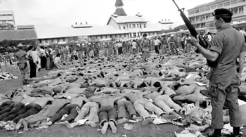 This period of democracy was brief. Right-wing militias and the Thai military quickly reasserted their dominance by terrorizing and massacring students at the Bangkok university again in 1976. They stormed the university, forced the students to strip and gather in the athletics fields, and finally the militias swept through to lynch, beat, and burn people to death.[45] Thongchai Winichakul, a former student activist who was there, bitterly calls the massacre, "a culmination of years of state-sponsored radical propaganda, vandalism and assassination plots."[47]