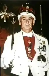 A UFO wiki claims "In 1980, King was also dubbed 'Sir George King' by His Royal and Imperial Highness Prince Robert Khimchiachvili, the 74th Grand Master of the Sovereign Order of Saint John of Jerusalem, Knights of Malta."[17] According to the New York Sun, "From 1970, Prince Robert M.N.G. Bassaraba de Brancovan-Khimchiachvili-Dadiani ran a bogus Order of St. John of Jerusalem, Knights of Malta from his faux-marble apartment (filled with equally genuine Louis XV furniture) at 116 Central Park South. If you had a passage fee, he had a gong for you, and hundreds of men and women with more money than sense each paid him up to $30,000 for his phony knighthoods."[18][19] Khimchiachvili and two associates were later convicted of wire fraud.[20]