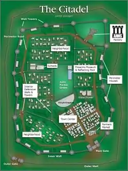 The Citadel is a proposed planned community in the mountains of Idaho, designed to be a "bastion of liberty", complete with a pseudo-medieval curtain wall and towers.