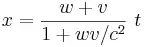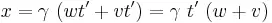 If some object is moving forward at speed w in the primed frame, which is itself moving at speed v relative to the unprimed frame, how fast does the unprimed observer think the object is moving? The Galilean answer is w+v, of course. Under Relativity, we have