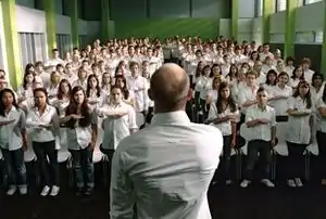 On the second day, "strength through community" was introduced. He was surprised to find that all the rules introduced were followed perfectly. He made up stories of his past to teach this. The phrases "strength through discipline" and "strength through community" were made the motto, and all the students were successfully taught to recite it. At the end the class he had created a secret salute for members of the Wave, which was a cupped hand raised up to one's chest. Once again, nobody questioned it.[1]