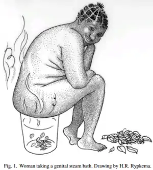 Vagina steaming is a hot newly revived alternative medicine in which a woman squats over steaming water. The practice is also called vaginal steaming, v-steaming, vaginal steam baths, yoni steaming,[note 1] steamed clams,[note 2] chai yok (차욕),[note 3] or bajos.[note 4]