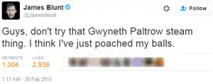 70. Guys, don't try that Gwyneth Paltrow steam thing. I think I've just poached my balls. by James Blunt (1:17 AM - 20 Feb 2015) Twitter (archived from 28 Apr 2016 04:14:50 UTC).