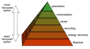 The waste hierarchy, or the hierarchy of waste management is a series of five or six options for dealing with waste. It is a more complex version of the "reduce - reuse - recycle" green arrowed triangle logo which ranks as how favourable each option is from an environmental perspective. However, it tends not to say anything about cost or practicality.