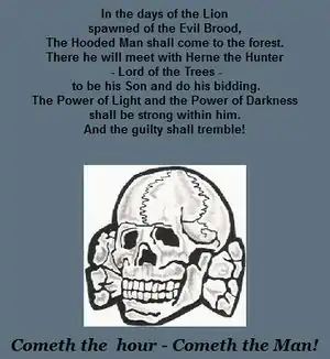 In the days of the Lion, spawned of the Devil's brood, the Hooded Man shall come to the forest. There he will meet Herne the Hunter, Lord of the Trees, to be his son and do his bidding. The Powers of Light and Darkness shall be strong within him. And the guilty shall tremble.