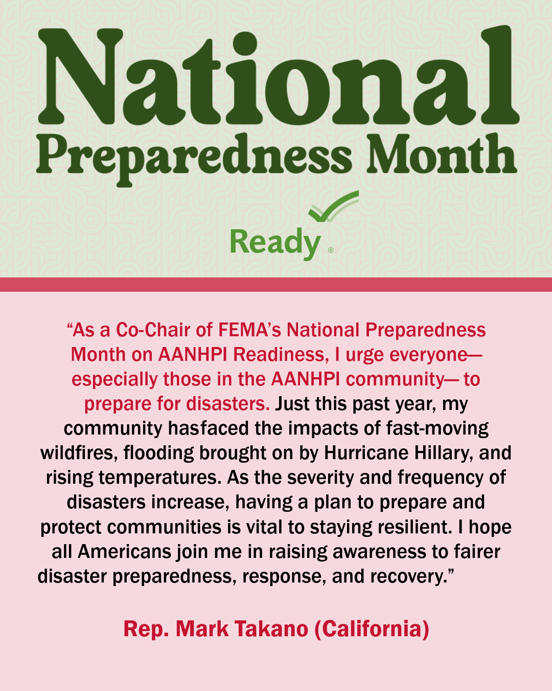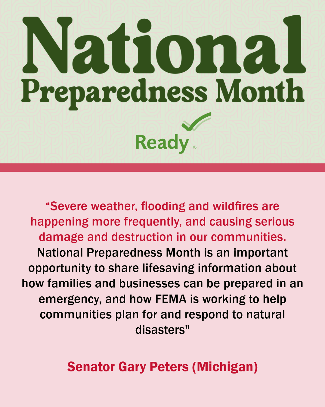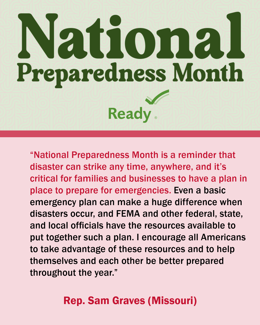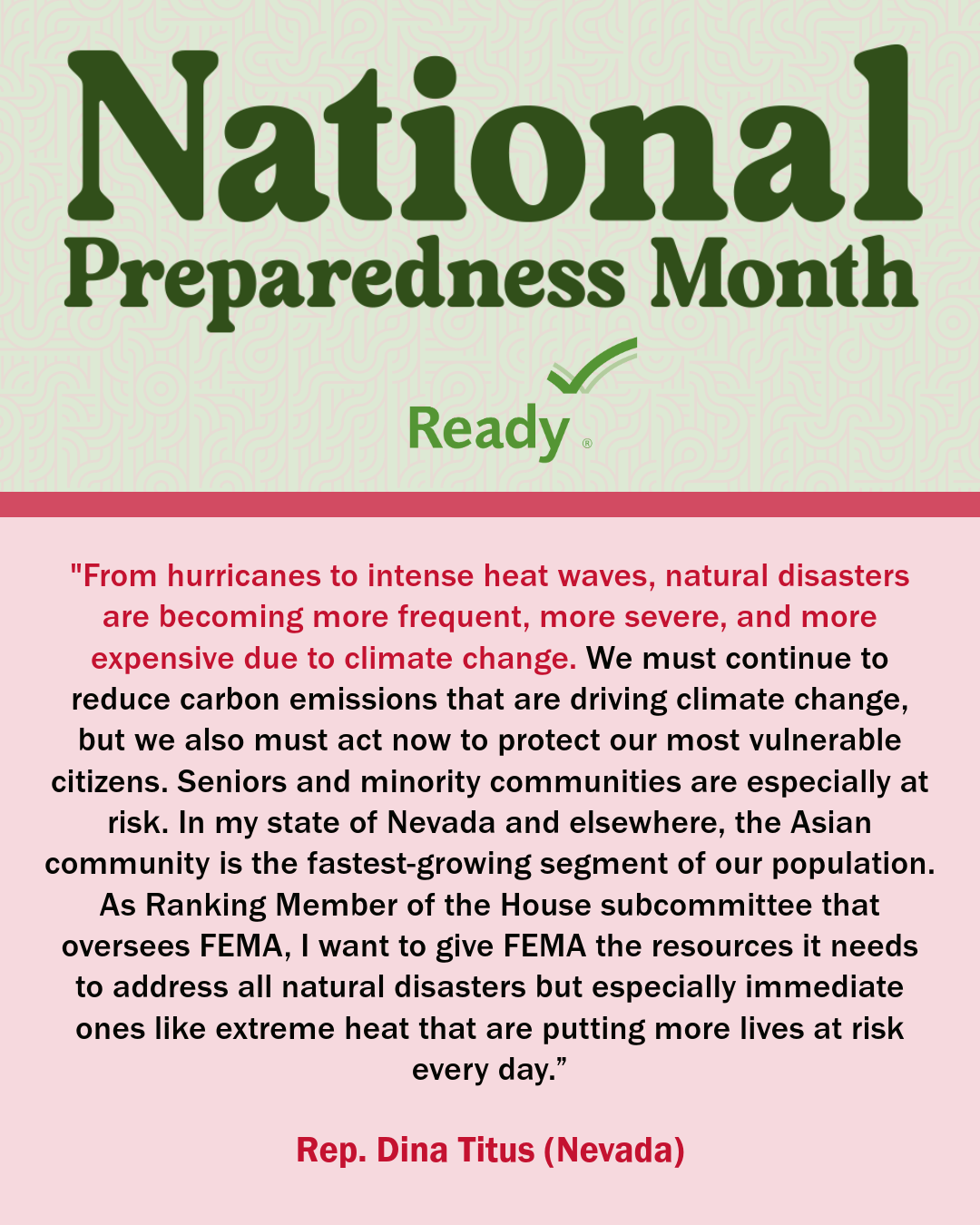 A collection of graphics featuring quotes from the 2024 National Preparedness Month Congressional Co-Chairs.