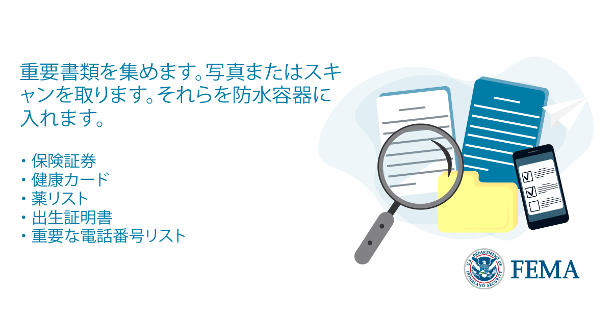 重要書類を一つにまとめてください。 写真を撮るかスキャンをしてください。防水性の容器に入れてください。 また以下のものを必ず一緒に入れてください- 保険契約書、健康保険カード、 薬のリスト、出生証明書、重要な電話番号のリスト。