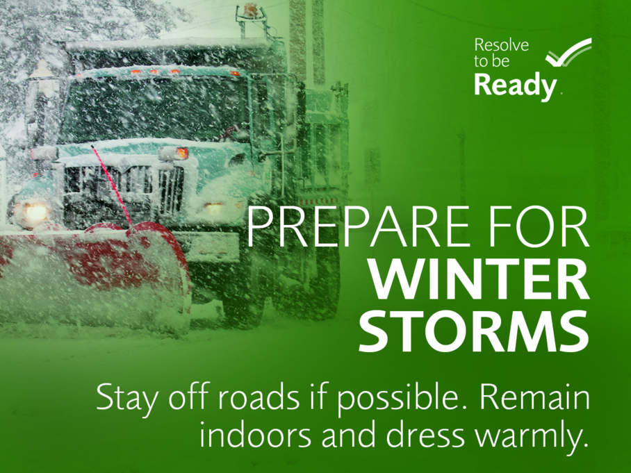 A plow truck plowing snow in a storm. Text reads: Prepare for winter storms. Stay off roads if possible. Remain indoors and dress warmly.
